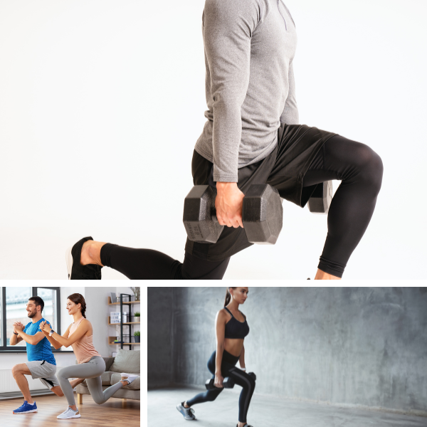 - 어깨너비로 서서 발 앞으로 한 발을 내딛으며 몸을 앞으로 내려놓고 양다리가 90도 각도가 될 때까지 몸을 낮춥니다.