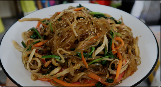 잡채는 당면, 야채, 때로는 쇠고기나 기타 단백질을 넣고 볶은 요리입니다. 다채롭고 맛이 좋으며 미끄러운 질감은 장수와 행복을 의미합니다. 이 요리는 종종 축하 행사에 제공되므로 추석과 같은 축제 행사에 적합합니다.