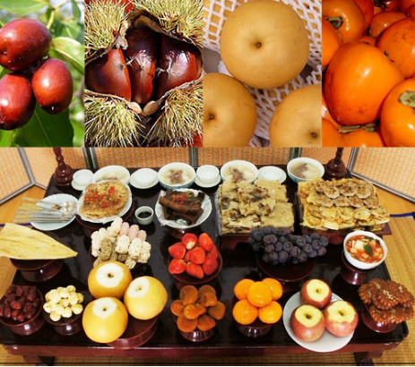 사과, 배, 감 같은 과일은 차례의식에 필수적입니다. 이는 수확을 상징하며 자연의 선물에 대한 감사를 표현하는 방법입니다. 신선한 제철 과일은 사람과 환경 사이의 균형과 조화에 대한 아이디어를 강조합니다.